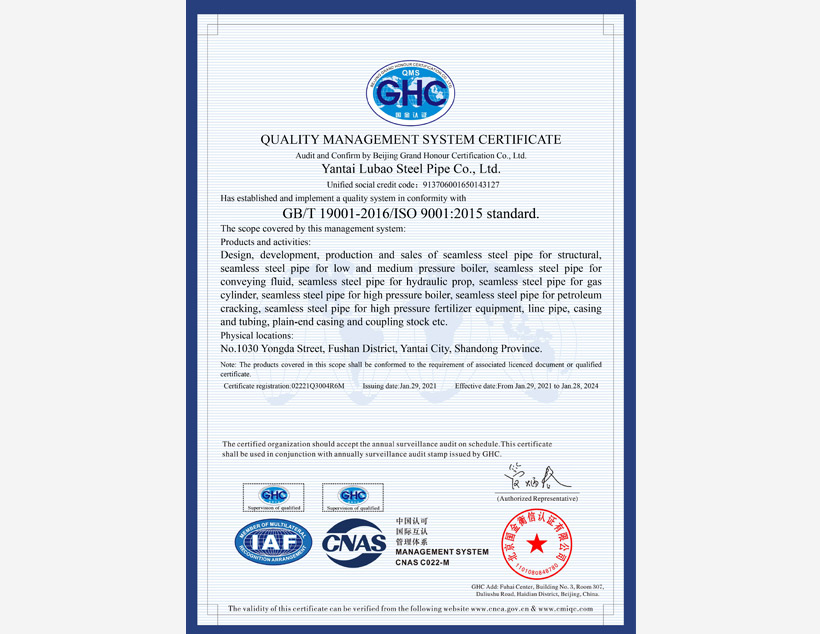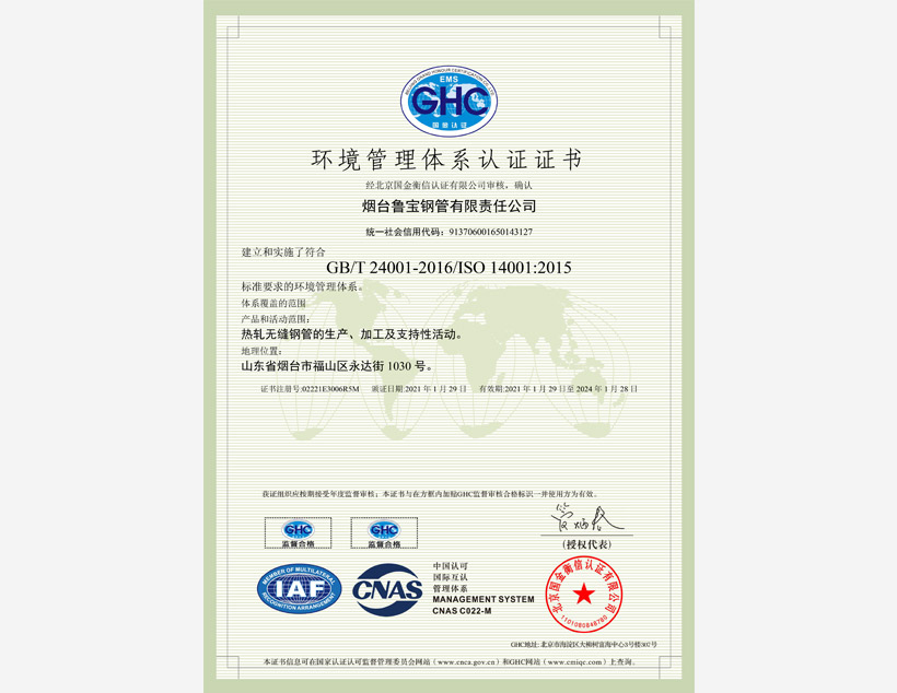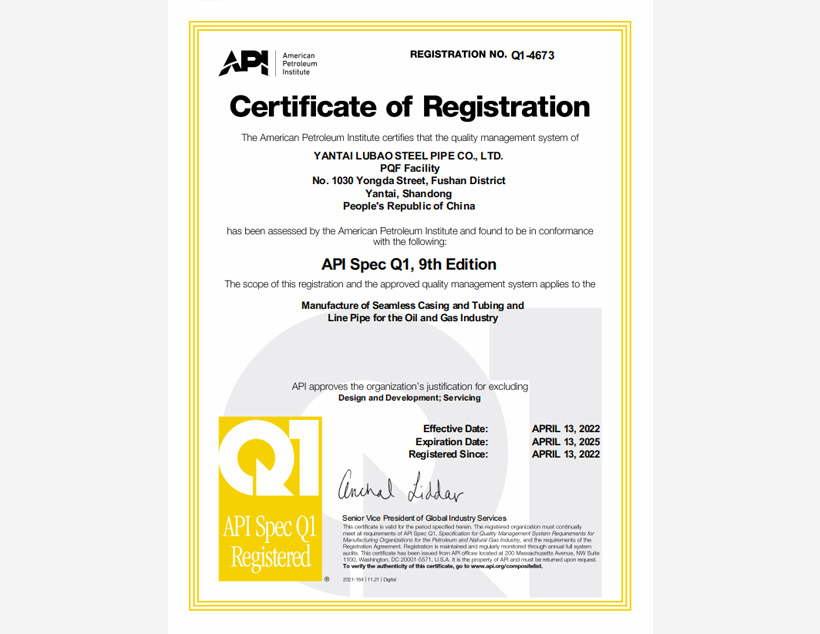 公司管理體系取得API Q1、ISO 9001、ISO 14001、ISO 45001和ISO 50001標準認證證書,實驗室取得ISO/IEC 17025認可證書。